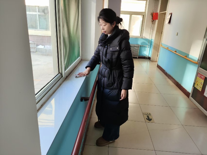 接下來,王欣雅同學細心地為老人們打掃宿舍,確保他們的居住環境整潔有序。徐小蕾同學則將老人們的被子拿到陽光下晾曬,讓老人們晚上能蓋上溫暖舒適的被子入睡。