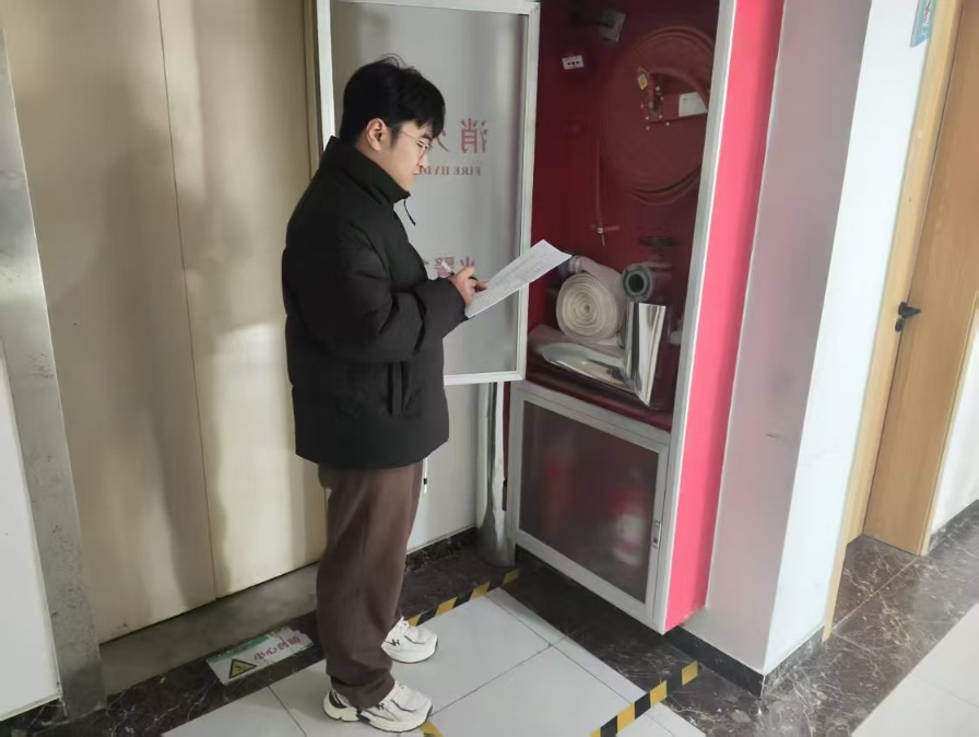 圖為實踐團成員薛成瑞檢查消防設施