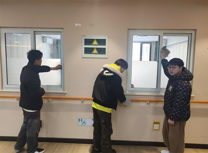 活動當天清晨,養老服務中心內三名身著厚實羽絨服的青年志愿者站在窗前,手持抹布認真擦拭玻璃。陽光透過窗戶灑進房間,映照在他們專注的表情上。窗戶上原本的灰塵和污漬在他們的努力下逐漸消失,室內頓時明亮了許多。