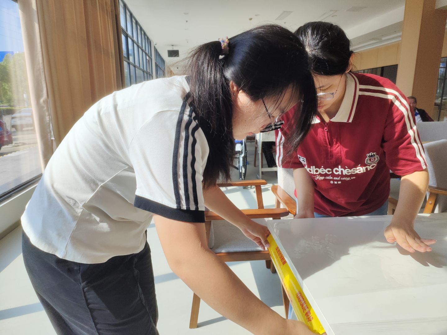 下午2點半到3點半,公寓一樓活動區開展大學生匯演活動。志愿者們在積極參與籌備活動的同時,社工部的志愿者們策劃后期活動與打印文件資料;辦公室的志愿者們整理相關資料,排查養老院檔案文檔;失智專區的志愿者制作了彩紙小卡,用通俗易懂的方式傳播著專業知識,讓老人簡單了解英語的魅力。這些準備使得下午的活動開展的井然有序,養老院的老人對活動也給予了高度的評價,活動現場妙趣橫生。
