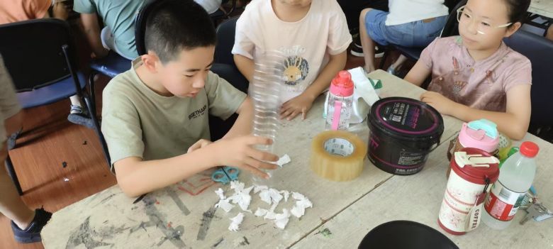 在葉承翰老師的指導下,孩子們分組進行實驗:裁剪瓶身、連接膠帶、觀察紙片吸附過程。三年級的林子恒小心翼翼地操作著,當看到自己手中的紙片也被成功“吸入”瓶中時,他興奮地跳了起來:“原來不用手就能讓紙動起來,科學太神奇了!” 實驗過程中,孩子們時而蹙眉思考,時而互相討論,小臉上寫滿了對科學的好奇與探索欲。