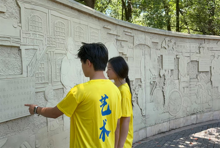 圖為團隊成員正在了解浮雕所展現的革命歷史事跡 夏偉 供圖