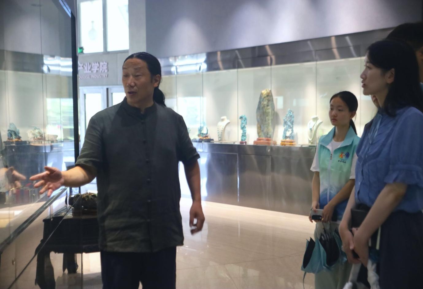 圖為綠松石產業園老板為我們介紹生漆與綠松石結合的設計理念 通訊員 洪建豪