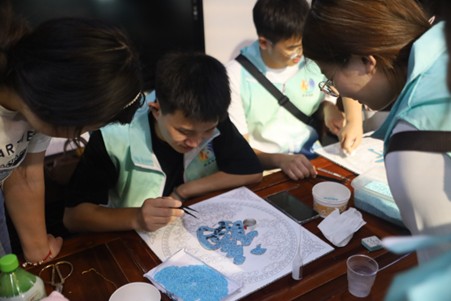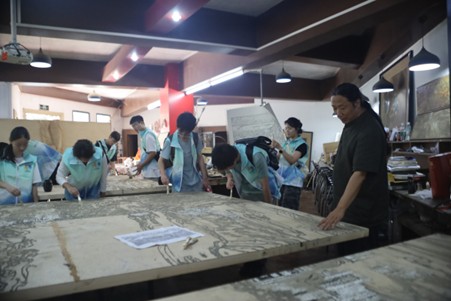 圖為霖漆與共團隊成員在劉善林教授的指導下進行漆畫創作工作 通訊員 陳玉潔