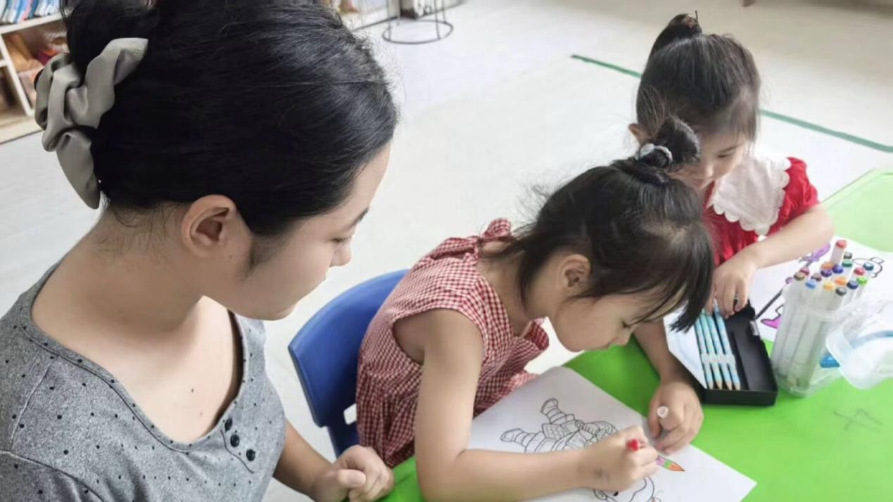 圖為實(shí)踐隊(duì)隊(duì)員指導(dǎo)小朋友們畫畫。閆亦凡 供圖