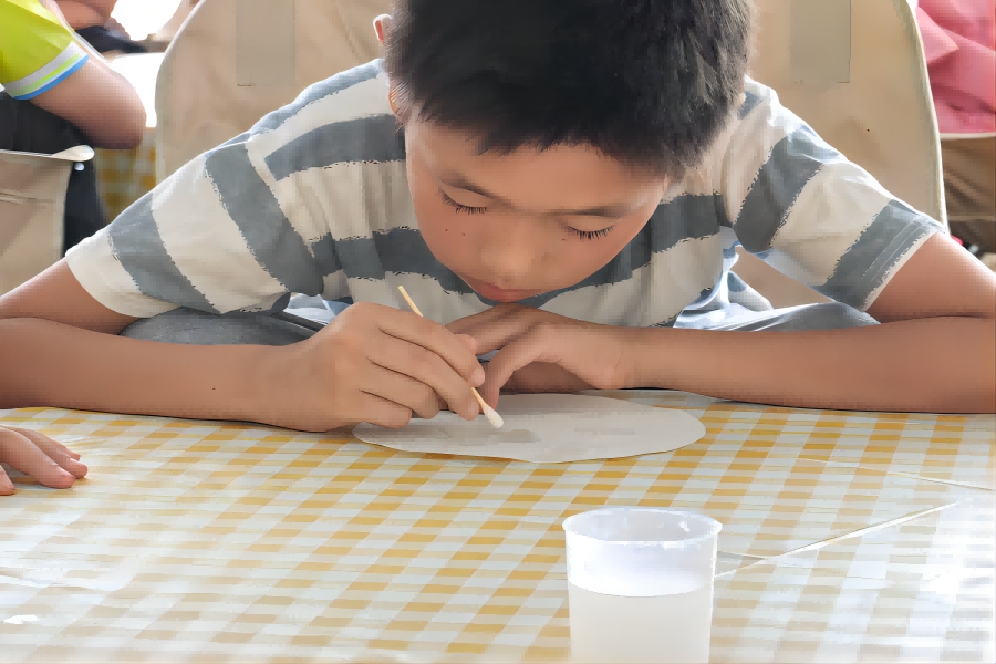 密信制作興趣課在碘鐘實驗后展開。隊員們提前準備四種制作方法,組織孩子們分組嘗試。其中一種方法中,孩子們用棉棒蘸取淀粉溶液在紙上書寫,待紙張干透后字跡消失,噴上碘液便能重新顯色。隊員們在各組間巡回指導,引導孩子們觀察不同方法中的顏色變化,尋找其中的共性規律。孩子們低頭認真書寫,有的寫下秘密,有的描繪夢想,在化學變化的奇妙中,為他們的秘密與夢想找到了獨特的隱藏與呈現方式。