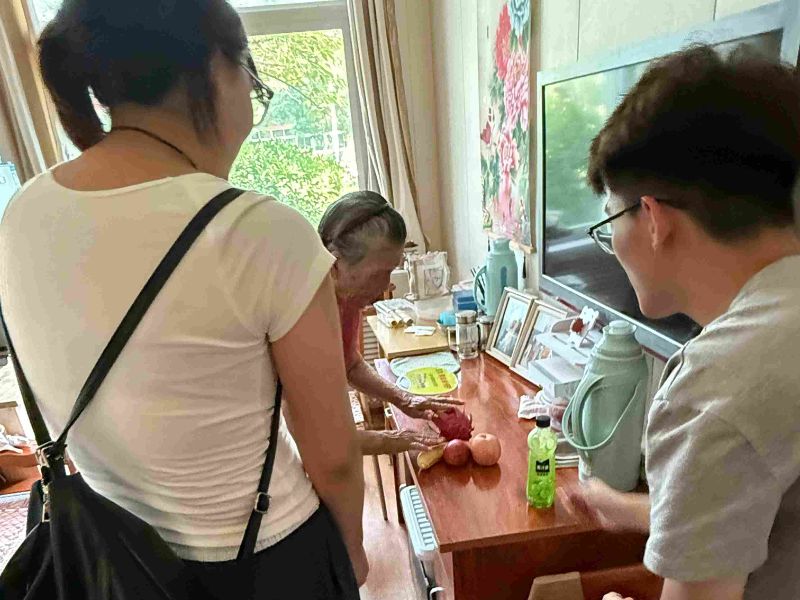 在精心安排的時間點,黃俊杰與李文靜還負責為老人們分發水果、點心等食物,確保老人們能及時享用。