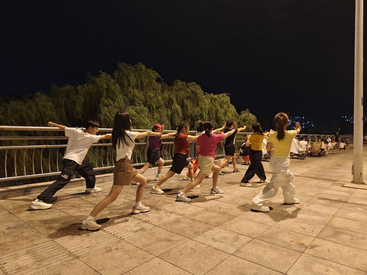 (圖為社區成員跟隨實踐隊成員學習武術廣場舞。王夢雨供圖)