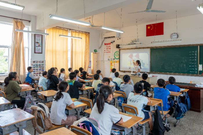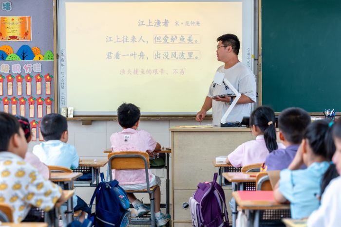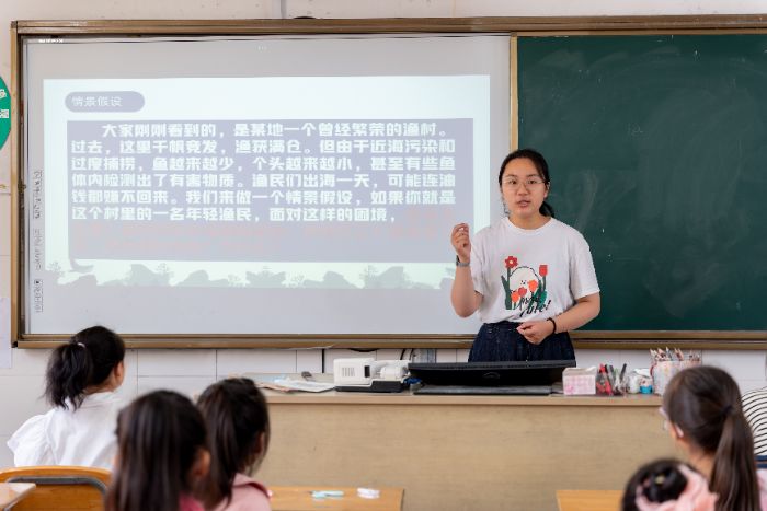 投影儀上流淌出“云兒飄在海空,魚兒藏在水中”的歌詞,首堂“詩中漁影,千年傳承”課由此拉開序幕,像一汪清泉漾起層層波光。視頻里,漁夫撒網、補船的畫面引領同學們闖入漁家的奇妙世界,喚醒了對漁民生活的點滴記憶。