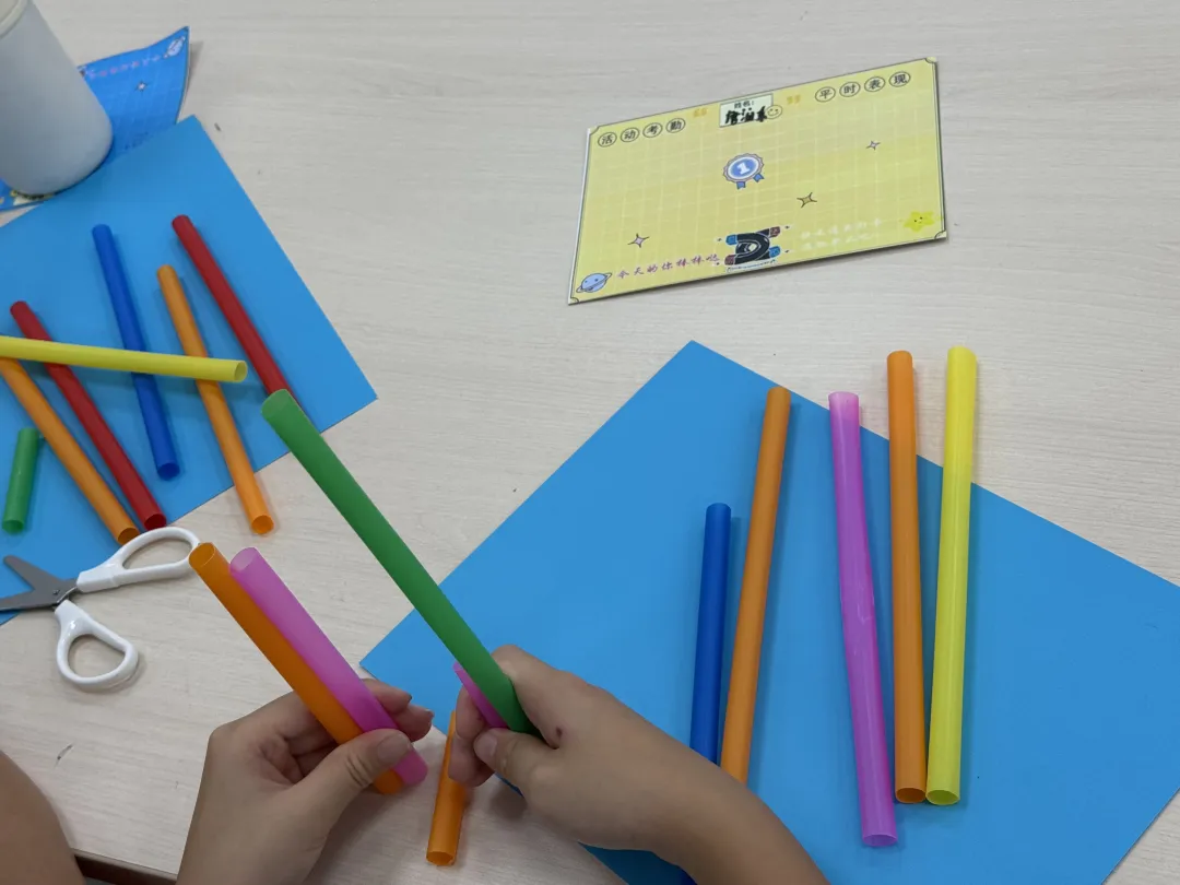課堂一開始,課桌上五彩繽紛的吸管便立刻吸引了孩子們的目光。面對(duì)孩子們好奇的疑問,授課老師笑著回答:“這可不是普通的吸管,它們馬上就會(huì)變成能唱歌的‘吸管排笛’!”孩子們紛紛瞪大雙眼。在老師分步演示后,孩子們化身小小工匠,迫不及待地投入制作:剪裁吸管、粘貼固定、密封底口。一時(shí)間,教室里剪刀的“咔咔”聲、膠帶的“撕拉”聲此起彼伏,熱鬧非凡。在助教老師的協(xié)助下,孩子們仔細(xì)調(diào)整吸管長(zhǎng)度、認(rèn)真封口,直到每一根吸管都筆直、整齊、不漏氣才滿意。孩子們專注的眼神、稚嫩的動(dòng)作展現(xiàn)著專注與熱情,無不透露出對(duì)即將誕生的樂器的期待。當(dāng)一支支色彩斑斕的排笛在孩子們手中誕生,教室里立刻變成了歡樂的音樂海洋。各種清脆或稚拙的音符此起彼伏,孩子們興奮地站起身,爭(zhēng)相吹響自己的作品,臉上洋溢著成功的喜悅。