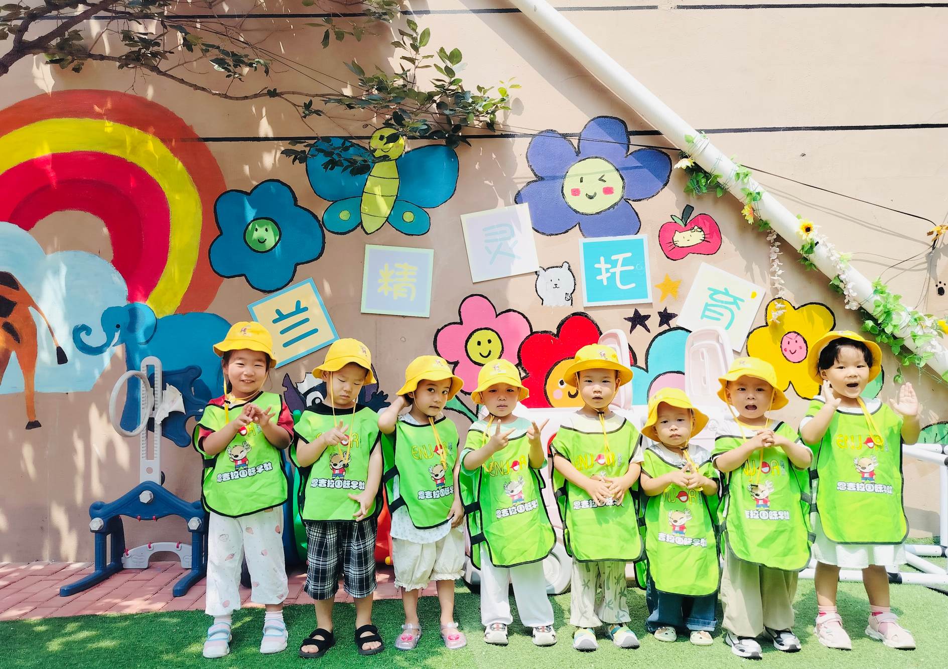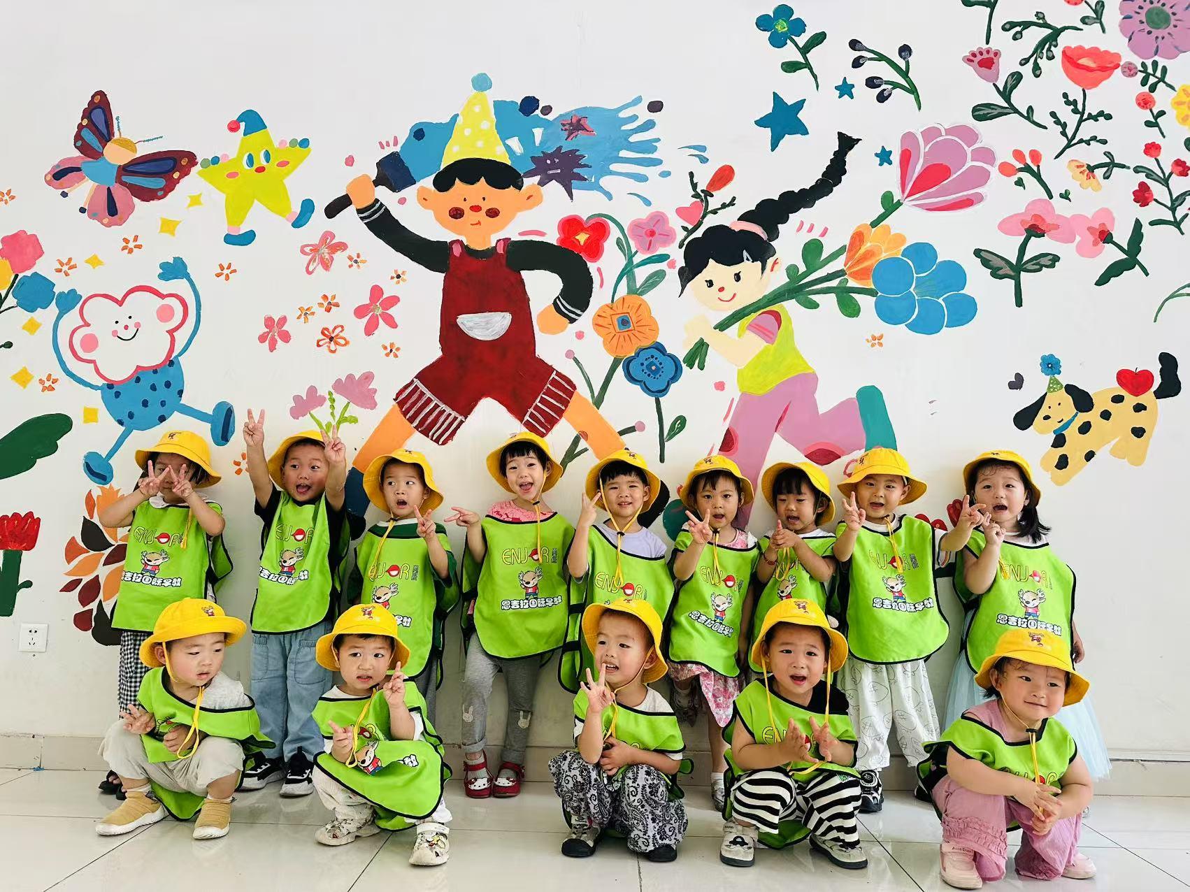 (圖為孩子們在兒童活動區墻繪下合影)