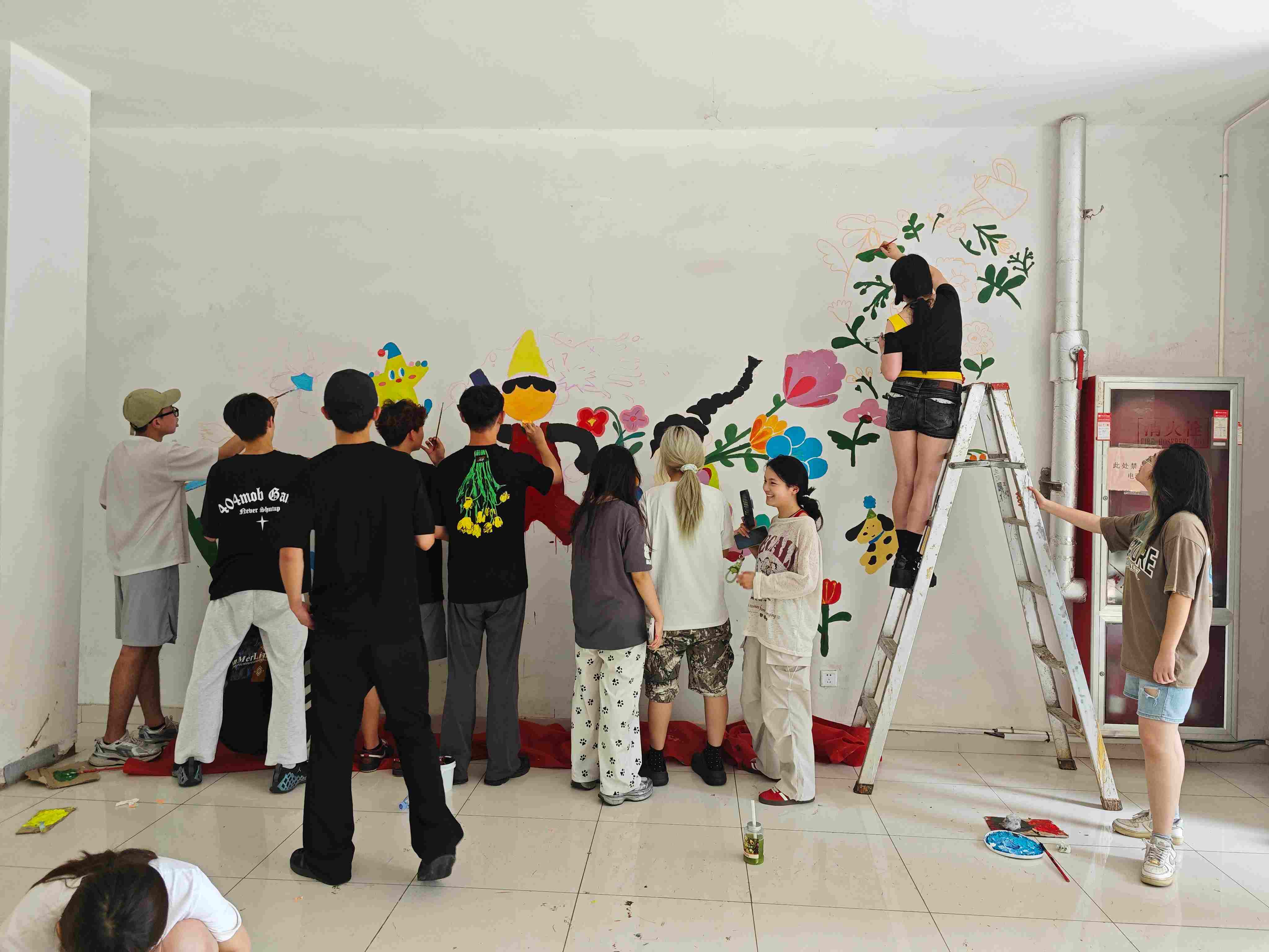 座談會后,“承藝匠心”實踐團隨即前往蘭精靈托育中心開展墻繪創作。結合托育中心墻面素雅的基礎風格,實踐團成員立足專業視角,在創作構思階段便精準融入童真主題元素,充分彰顯專業素養與創作巧思。當日氣溫較高,隊員們雖汗流不止,但創作熱忱絲毫未受影響。此次墻繪創作不僅為托育中心的孩子們打造了富有想象力的成長環境,更以藝術為媒介,讓美育理念在潛移默化中浸潤兒童心靈,實現了專業實踐與育人價值的有機統一。