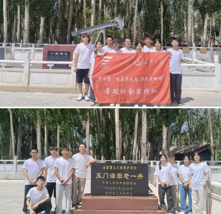 老一井與老君廟:精神傳承的現場課堂 從紀念館出來,實踐隊奔赴老一井、老君廟。油田鉆井模型矗立在陽光下,紅與藍的機械結構,像一座精神坐標。隊員們圍著模型打轉,有人俯身測量鉆桿角度,有人用手描摹齒輪紋路。“當年就是靠這些‘鐵疙瘩’,把‘中國貧油論’砸得稀碎。”話語里,是對先輩智慧的驚嘆,更是對“鐵人精神”落地生根的共情。