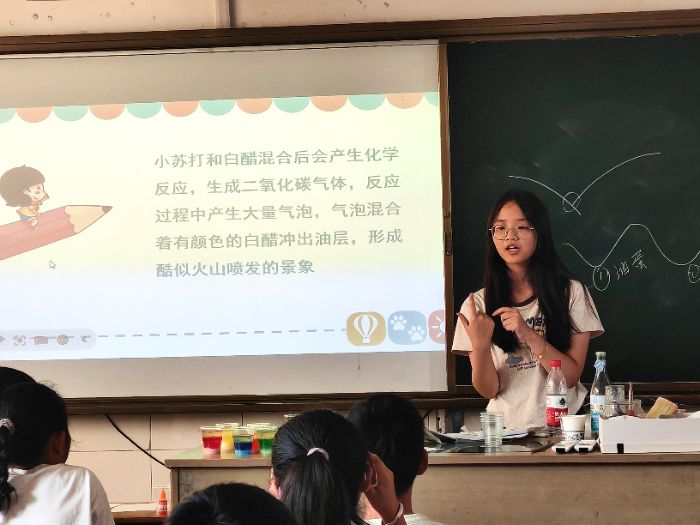 最后一節(jié)課以“海底火山爆發(fā)”和“彩虹泡泡龍”兩個趣味實驗為核心,帶領學生們探索科學奧秘。在“海底火山”實驗中,學生們通過小蘇打與白醋的反應,模擬了火山噴發(fā)的場景,并理解了密度與化學反應的原理。