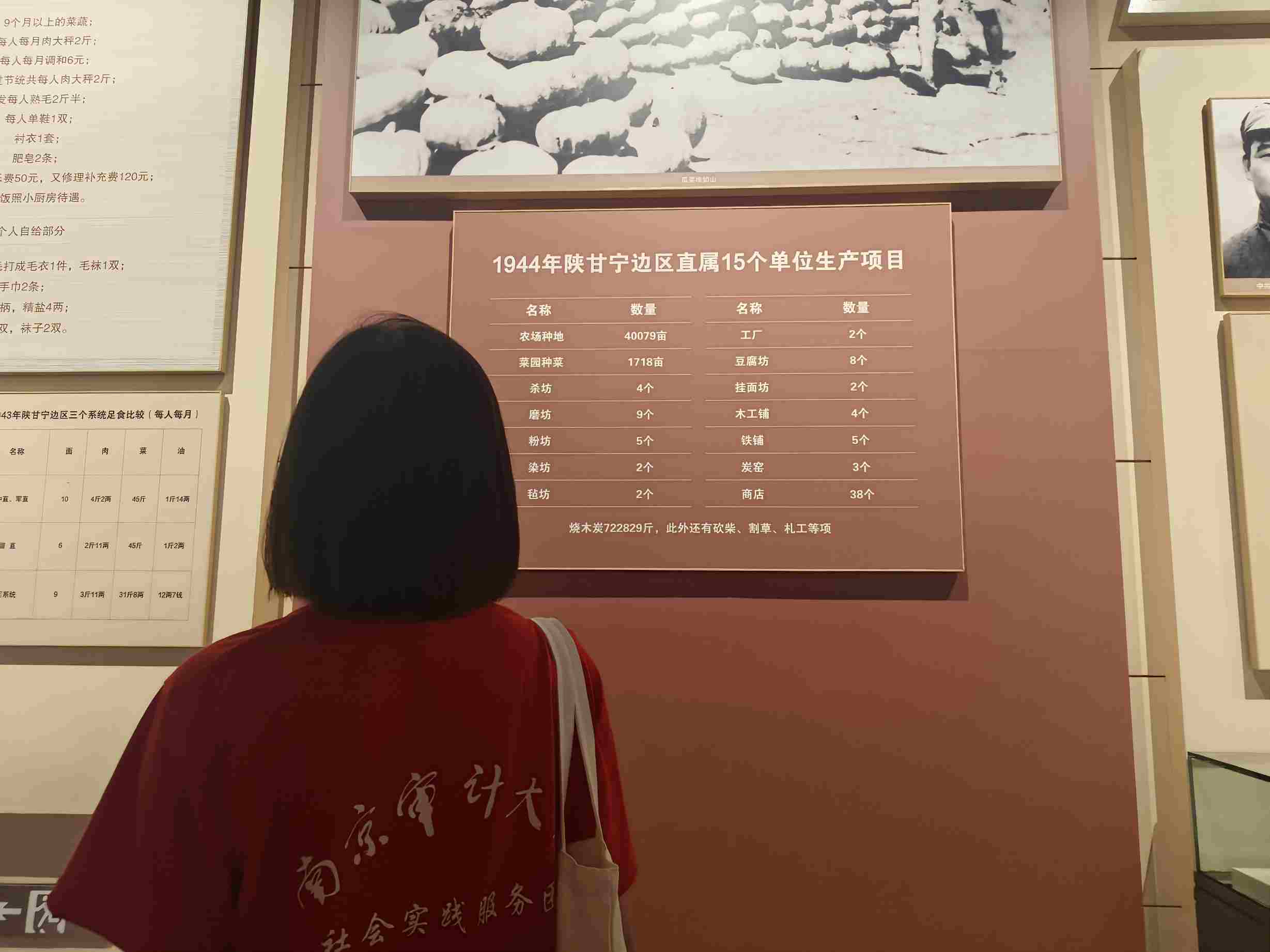 隨后,實(shí)踐隊來到南泥灣大生產(chǎn)運(yùn)動展覽館。這里曾是“自力更生、艱苦奮斗”的南泥灣精神誕生地。走進(jìn)展館,隊員們被一幅幅訴說歷史的照片和一件件斑駁的農(nóng)耕工具深深吸引。從簡陋的犁耙到粗糙的紡車,每一件展品都訴說著當(dāng)年革命戰(zhàn)士與人民群眾并肩勞動、開荒生產(chǎn)的艱辛歷程。展館中央的沙盤模型生動展示了“爛泥灣變陜北好江南”的奇跡,隊員們駐足良久,驚嘆于革命先輩如何在貧瘠的土地上創(chuàng)造出萬畝良田的壯舉。為更深入理解南泥灣的歲月痕跡,實(shí)踐隊結(jié)合學(xué)科特色,通過對比開墾前后的糧食產(chǎn)量、耕地面積等數(shù)據(jù),形象感知革命先輩通過勤勞的雙手和堅定的信念,創(chuàng)造出了一個“平川稻谷香,肥鴨遍池塘。到處是莊稼,遍地是牛羊”的陜北好江南。