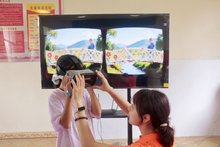 科技筑夢(mèng):紙橋里的家鄉(xiāng)未來 為了點(diǎn)燃孩子們心中更大的工程夢(mèng)想,服務(wù)隊(duì)巧妙地運(yùn)用科技讓冠軍組紙橋“走出”課堂。首先利用AI圖像生成工具,輸入冠軍組紙橋的關(guān)鍵結(jié)構(gòu)特征和鄉(xiāng)村常見場(chǎng)景關(guān)鍵詞。冠軍組紙橋瞬間“化身”為溪流上的竹木小橋、連接田埂的堅(jiān)實(shí)便橋。接著,服務(wù)隊(duì)將生成的圖片導(dǎo)入VR眼鏡里,當(dāng)孩子們戴上VR眼鏡,他們看到小朋友腳下踩著的正是以他們冠軍紙橋?yàn)樵?ldquo;建造”的鄉(xiāng)村小橋,他們可以“走”上橋面,低頭觀察橋下熟悉的加固結(jié)構(gòu)如何支撐行人。這一刻,抽象的工程原理變成了可觸摸的家鄉(xiāng)未來圖景。