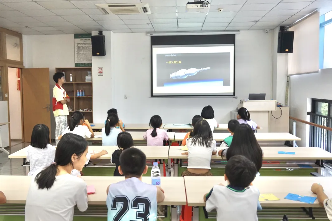 授課老師以震撼的中國航天史視頻拉開序幕。從1970年“東方紅一號”劃破天際,到2025年“神舟二十號”再探蒼穹,一個個里程碑在孩子們眼前鋪陳開來。錢學森毅然歸國的赤子之心,楊利偉艱苦訓練的拼搏身影,化作最生動的教科書。孩子們凝神屏息,從科學家們“用汗水澆灌夢想”的故事中,讀懂了航天偉業背后深沉的家國情懷與不屈意志,悄然埋下理想信念的種子。