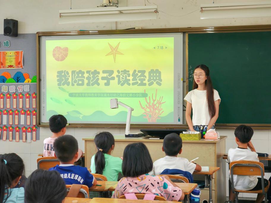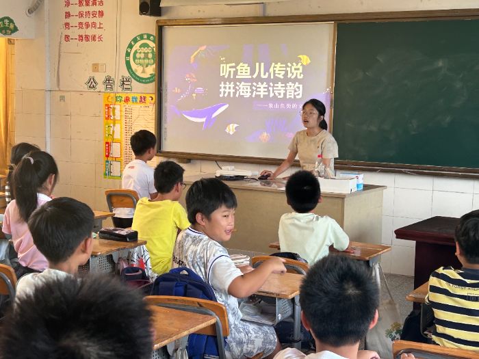 清晨,第一縷陽光照亮象山縣高塘島——這座東海之濱的小島,教室里響起了孩子們爽朗的笑聲,他們眼中閃爍著強烈的求知光芒。寧波大學教師教育學院滴水行動之海韻文耕小分隊在假日學校的第五天,推出了四節(jié)以“海”為核心的課程,它們像四顆璀璨的寶石,共同構(gòu)成了一場融合科學探索、文學滋養(yǎng)、視聽震撼與詩意創(chuàng)作的海洋啟蒙盛宴。大學生志愿者們憑借真誠與智慧,為海島孩童開啟了一扇通往藍色世界的奇妙大門。