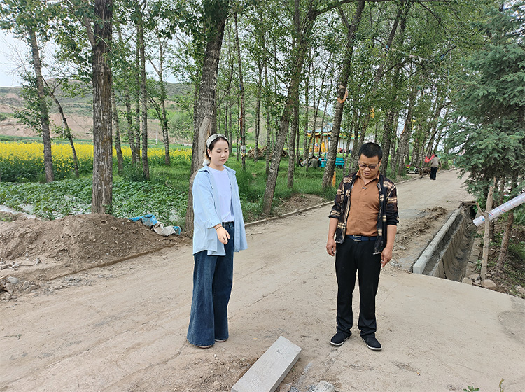 村里正進行道路修繕工程,實踐團成員利用間隙與村干部一同在村內走訪。沿著待修的路段查看,聽村干部介紹施工進展和遇到的問題,不時就路面寬度、排水設計等提出自己的看法。