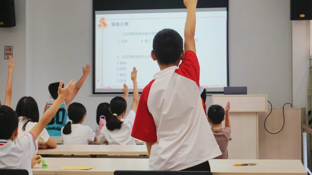 課堂伊始,授課老師從聊一聊自己的鞋子引入課程,成功激發孩子們積極討論分享自己的鞋子的興趣,瞬間抓住小朋友的注意力。隨后老師在屏幕上展示了一張發黃的照片,一雙草鞋靜靜地呈現在畫面中,鞋面上綴著兩個精致的小繡球。照片一亮出,孩子們的目光立即被吸引,驚訝聲此起彼伏:“這個是哪個年代的鞋子啊?”“上面為什么有球?”有人甚至俯身靠近屏幕,試圖看清鞋子的紋路。老師笑著提問:“你們猜,這雙鞋是誰穿過的?”孩子們面面相覷,一番思考過后,幾位膽大的學生爭相回答:“可能是農民?”課堂氣氛頓時活躍起來,課堂懸念就此設下。通過實物導入,一雙普通的草鞋成為引發好奇的“問題場”,這樣的課堂安排不僅打破了傳統講述紅色教育的單調模式,也在“看”和“想”的過程中調動了孩子們的積極探究情緒,為接下來的深入學習埋下伏筆。