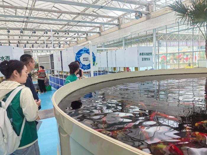 無土栽培展廳的技術創新更讓成員們駐足。螺旋管道式栽培的營養液循環流淌,廊架式栽培的錦屏藤氣根垂落如簾,荷蘭桶栽培的陶粒穩穩固定著植株根系。最令人稱奇的是魚菜共生系統:魚池廢水經過濾、殺菌后成為蔬菜的“營養液”,蔬菜吸收養分后又將清水回流魚池,形成“養魚不換水、種菜不施肥”的生態閉環。“我們的無土栽培營養液成本為零,奧秘全在這魚池里。”技術員笑著揭開謎底。