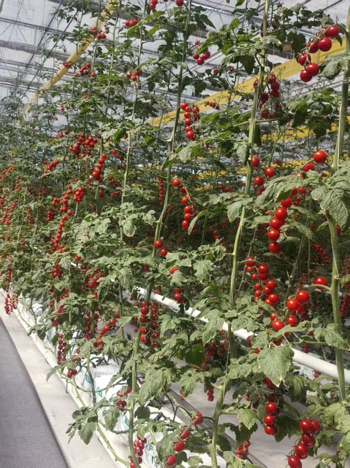 通過講解人員的講解,實踐團成員認識到降溫系統巧妙利用自然資源——對面濕簾與風機協同運作,“參考水空調原理,物理降溫,減少對作物損耗”。溫室采用荷蘭蔬菜工廠化生產技術,無土栽培的串收番茄“赤霞珠”如葡萄般垂掛,市場價高卻供不應求。下方軌道設計精妙:“一軌兩用,既供采摘車升降勞作,冬季夜晚又能如暖氣片般加溫。”