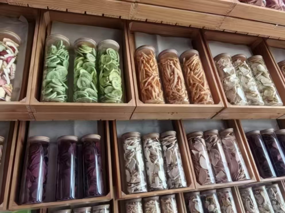 實踐團步入深加工產品展示區,玻璃罐中的果蔬脆色澤誘人。講解員強調其獨特工藝通過了低溫油浴脫水技術制成,用的是棕櫚油,在60度低溫下脫水,營養物質能保留,口感更好,避免了高溫油炸的油膩。展柜中一隅,苦蕎茶與野生菌靜靜陳列——2009年山東援建北川“維斯特”基地的高原產物,承載著特殊的時代記憶。