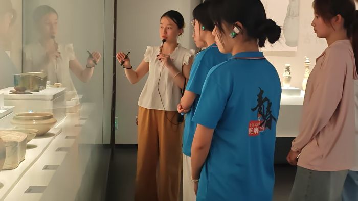 圖為講解宋代瓷器,包括河南登封窯珍珠地刻花瓷枕和江西吉州窯綠釉蕉葉紋瓷枕,除睡覺納涼外,還能保持女性發(fā)型,因高度較高,寓意“高枕無憂”。