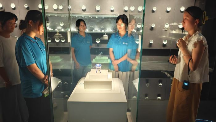 圖為講解徽州歷史博物館的“鎮(zhèn)館之寶”──元代藍釉爵杯