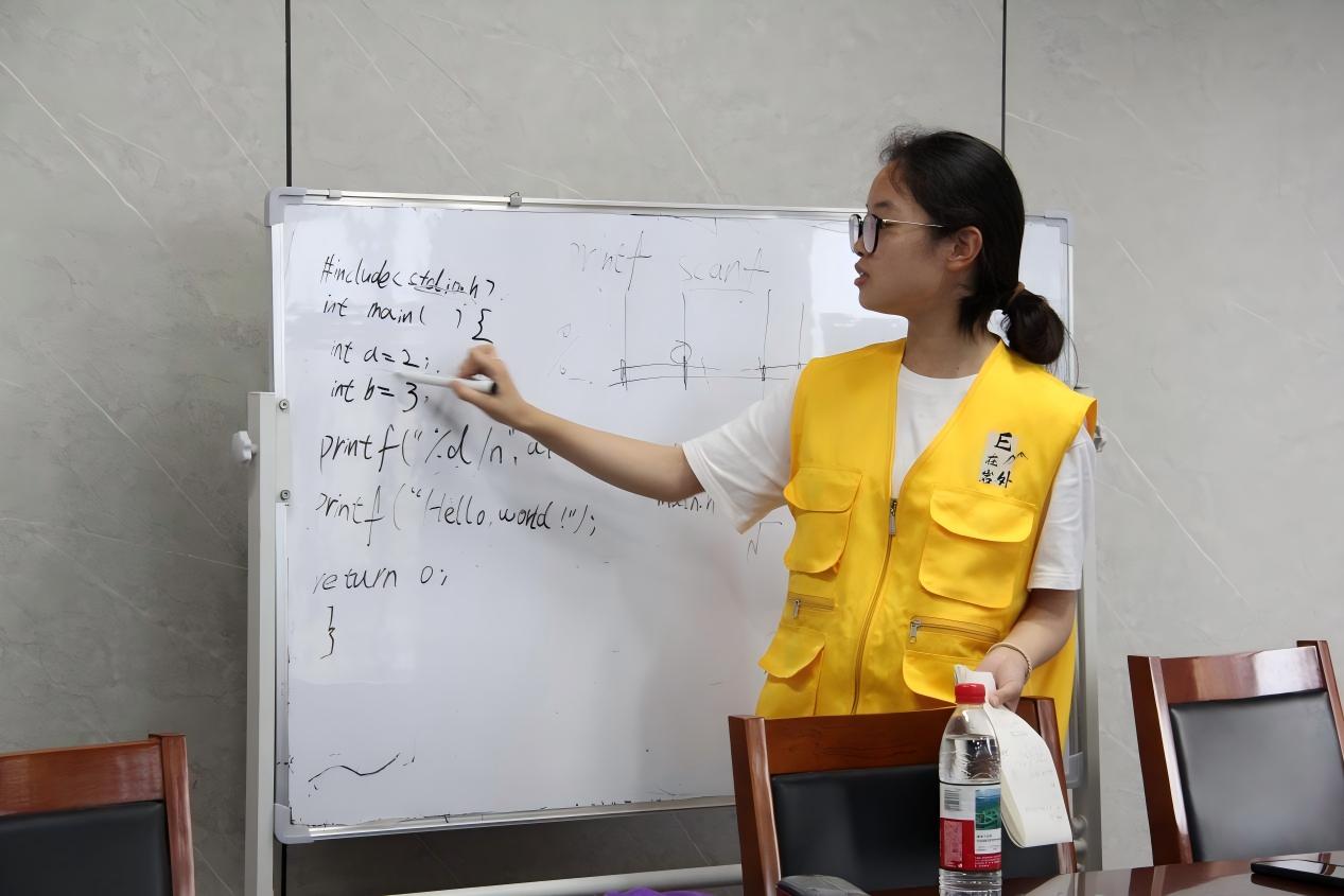 下午,實踐團成員向孩子們講解C語言編程基礎,帶領孩子們探索C語言奧秘。成員們重點介紹了C語言的核心概念,運用生活化事例,具象化解釋C語言的各種常用指令,例如頭文件、printf函數(shù)、格式化輸出等,引導孩子們接觸并理解計算機專業(yè)知識,并鼓勵孩子們學習編程,學習先進科學知識,爭做未來技術的創(chuàng)造者。