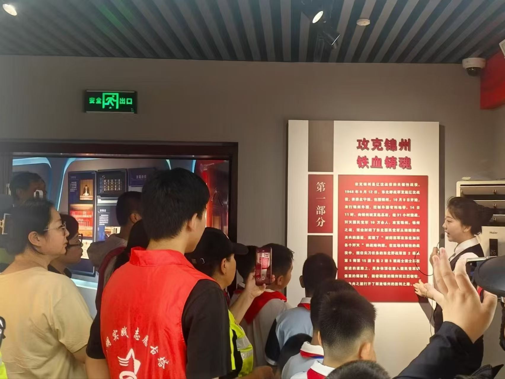 活動當天上午9時,實踐隊成員與社區代表在陳列館門口集合,在陳列館講解員的帶領下開始參觀。陳列館以“英雄永不落幕”為主題,通過實物展品、歷史照片、場景復原、多媒體演示等多種形式,全面展現了梁士英烈士的生平事跡與革命精神。講解員首先介紹了梁士英烈士的成長背景:他出生于貧苦農民家庭,年少時飽受壓迫,抗日戰爭爆發后毅然投身革命,在部隊中刻苦訓練、英勇作戰,迅速成長為一名優秀的戰士。隨后,在“遼沈戰役中的壯烈瞬間”展區,講解員詳細講述了1948年10月14日錦州戰役中,梁士英舍身炸碉堡的英雄事跡——當時部隊進攻受阻,敵人的碉堡火力壓制著沖鋒的戰士,危急時刻,梁士英主動請戰,抱著炸藥包沖向碉堡,在炸藥包受潮無法引爆的情況下,他毅然用身體抵住炸藥包,拉燃導火索,以生命為代價炸毀碉堡,為部隊開辟了前進道路,犧牲時年僅26歲。展區內,銹跡斑斑的軍裝、泛黃的戰地日記、還原戰斗場景的雕塑,讓在場人員仿佛回到了那個戰火紛飛的年代。實踐隊成員與社區代表認真聆聽講解,不時駐足凝視展品,許多人眼中泛起淚光。在多媒體互動區,大家通過影像資料重溫了遼沈戰役的歷史背景,更深刻地理解了梁士英烈士犧牲的意義——他的壯舉不僅為錦州解放奠定了基礎,更彰顯了革命戰士“為了人民利益不惜犧牲一切”的崇高信念。