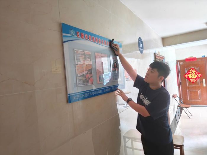 花壇及樹池周邊的雜草整治工作中,成員使用鋤頭根除蔓延植被,規范綠植生長空間,避免雜草侵占居民休閑區域。社區宣傳欄的玻璃面板及金屬框架經全面清潔。成員清除膠痕與積塵,保障政務通知清晰展示,提升社區信息傳播效率。