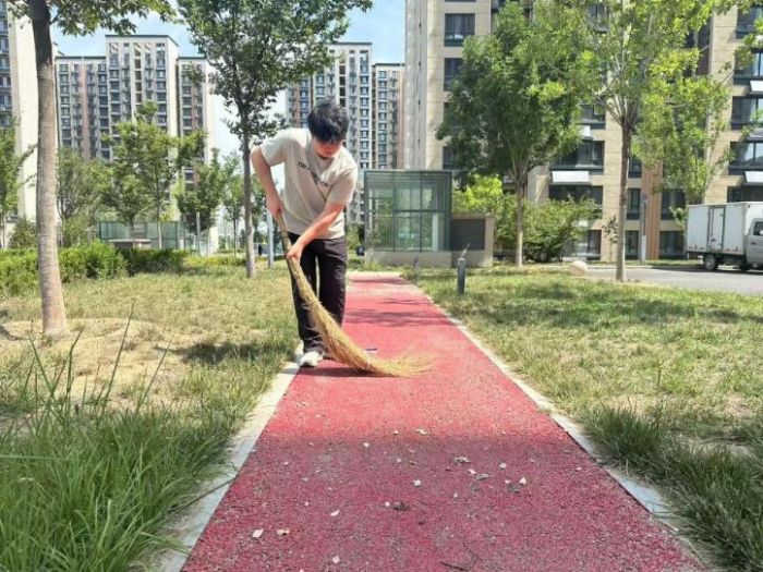 實踐團對小區(qū)主干道及健身區(qū)域的落葉實施集中清理。成員使用竹掃帚與環(huán)保垃圾袋清除落葉堆積物,保障人行通道暢通,維護公共區(qū)域景觀整潔度。