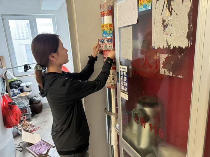 針對樓道電表箱、管道井違規張貼的小廣告,實踐團使用蒸汽清潔機配合刮刀實施清除,恢復公共設施表面完整性,阻斷非法廣告傳播路徑。