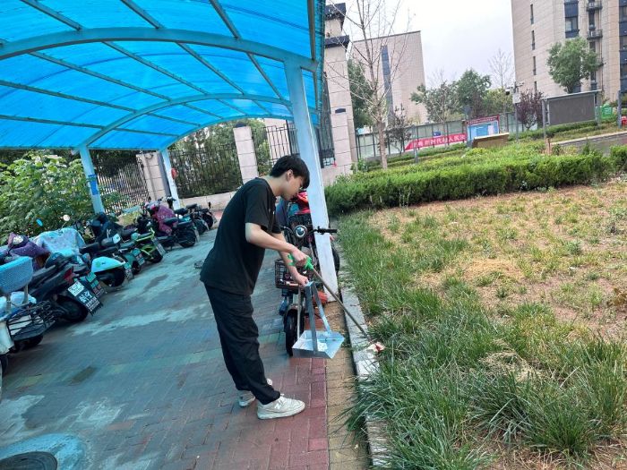 實踐團對小區主干道及休閑廣場的落葉實施集中清掃。成員使用防揚塵掃帚與可回收垃圾袋清除落葉堆積物,保障人行通道暢通,維護公共區域衛生整潔。綠化帶散落的塑料瓶、紙屑等雜物由成員分組清理。通過分類夾鉗進行分區排查,精準收集垃圾并轉運至回收站,有效改善綠化區域生態狀況。