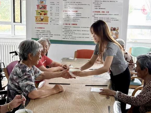 活動當天,隊員們一到敬老院便迅速投入忙碌中。在食堂區域,幾名隊員分工協作,認真地為老人們分發碗筷。他們動作麻利,將消毒后的餐具一一擺放整齊,確保老人們用餐時方便取用,分發過程中不時提醒老人們注意安全。