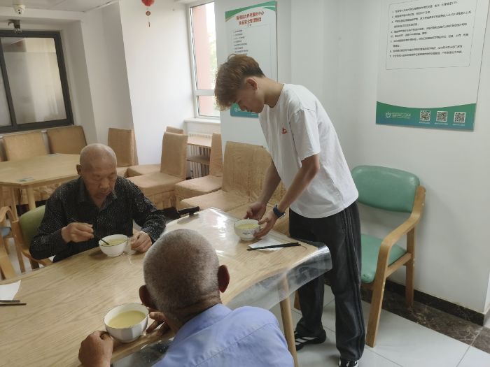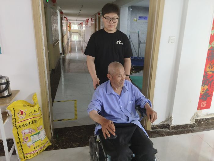 在天氣晴好的傍晚,魏栩博細心推著行動不便的老人至院內陰涼處,陪伴他們聊天,欣賞庭院景致,感受自然氣息。王學軍陪伴老人進行棋類對弈。在棋盤方寸之間,他們耐心引導、專注交流,為老人的日常休閑時光增添了互動樂趣。