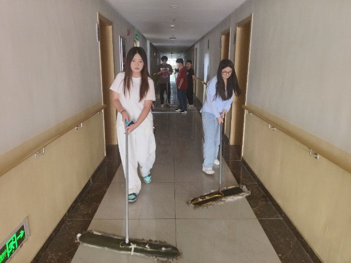 冷嬌主動承擔起樓道清掃工作。他仔細擦拭扶手、清潔地面,確保養老院公共空間的衛生整潔,為老人日常行走安全提供保障。高楠楠對養老院內的圖書閱覽室進行了系統整理。他們按類別重新歸置圖書,清潔書架灰塵,使圖書館面貌煥然一新,為老人創造了更愉悅的閱讀體驗。