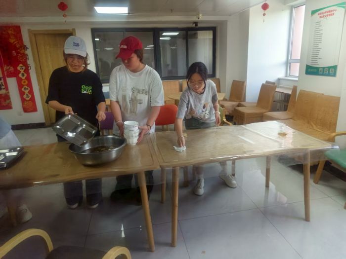 用餐時段后,楊玉茹清潔飯后餐桌。使用消毒液擦拭桌面,清除食物殘渣和油漬,并歸位餐具,確保餐廳區(qū)域的清潔衛(wèi)生,減少細菌滋生風險。為老人測量血壓。柳欣懿使用專業(yè)血壓計進行定期監(jiān)測,記錄數(shù)據(jù),并提醒健康注意事項,幫助老人及時了解身體狀況。