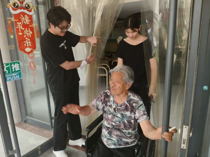 尹貽慷在戶外活動中推著老人散步。在天氣適宜時,使用輪椅或陪伴老人漫步于院內(nèi)花園,享受陽光和新鮮空氣。散步過程注重安全,避免老人勞累,增進身體活動。