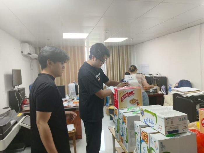 圖為實踐團成員孔振祥(左)與尹貽慷(右)為老人準備營養(yǎng)品