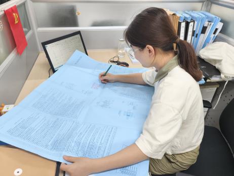 (圖為團隊成員楊雯整理并修改工程圖紙)