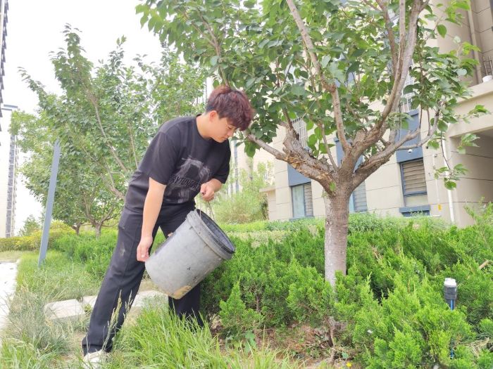 實踐團成員們開展了給植物澆水的活動。針對社區內的花壇、行道樹和綠化帶,實踐團成員使用水桶和噴壺進行系統性灌溉,確保植物在夏季高溫下獲得充足水分。