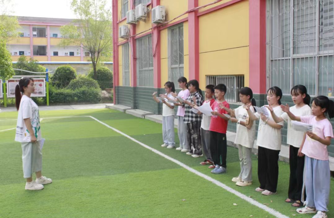 方音為根 普語為翼在三門村小學,實踐團以“講普通話 寫規范字”為起點,將拼音教學轉化為開啟文化之門的鑰匙。成員們帶領孩子們從《三字經》的啟蒙誦讀到《我和我的祖國》的深情詠唱,用標準普通話串聯中華文脈。此外,實踐團運用“柔性推普”策略,通過繞口令擂臺賽、方言與普通話“互譯游戲”、情景劇排練等趣味活動,讓孩子們在歡笑中自然接納普通話。一位扎著小辮的女孩在課間坦言:“雖然和同學玩說方言更順口,但老師的普通話也很好聽,我們都想學普通話。”推廣普通話,并非要替代鄉音,而是讓孩子們在守護方言根脈的同時,也能自信運用普通話連接更廣闊的世界。