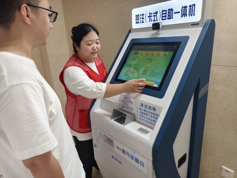 在政務服務大廳,身著紅色馬甲的實踐團成員,迅速融入服務角色。面對簽注(卡式)自助一體機遇到不會的群眾,耐心指導群眾操作,清晰講解簽注流程,確保群眾能夠順利完成簽注。