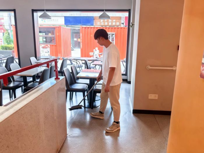 中心走廊及公共區域地面實施全面清掃。成員采用防塵掃具清除地面浮塵與雜物,重點處理角落積灰,降低老人活動區域滑倒風險。
