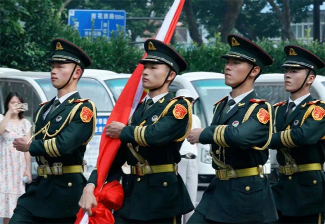 群雕疊階,松柏環繞,我校國旗護衛隊儀仗隊目光堅定,昂首闊步,護送五星紅旗,整齊劃一的動作,鏗鏘有力的腳步聲響徹國旗廣場,伴隨著雄壯的《義勇軍進行曲》,鮮艷的五星紅旗冉冉升起。