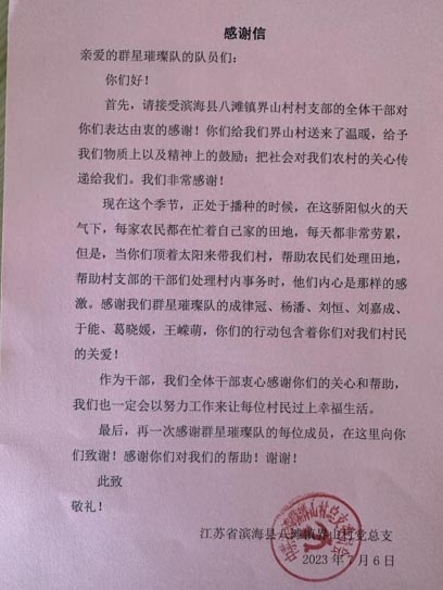 圖為八灘鎮界山村黨總支致隊員們的感謝信