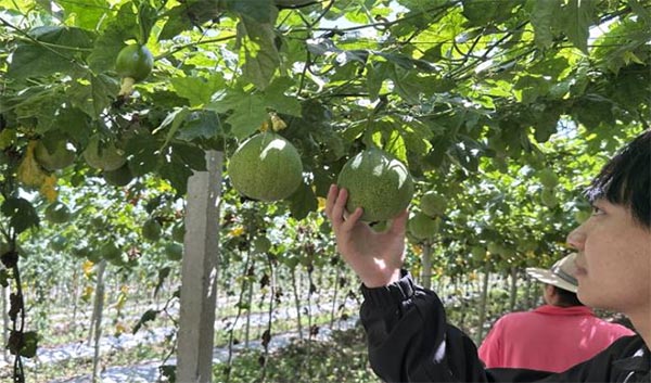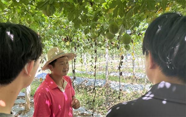 圖為瓜農向隊員們講解瓜蔞的生長過程,隊員們認真聆聽