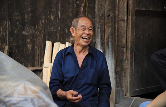 (在當地居民木屋前的石坪上,蛭惠民生團隊成員正在與幾位老人討論山蛭對他們自身及其散養放牧的牛羊狗豬雞等畜禽的危害情況)